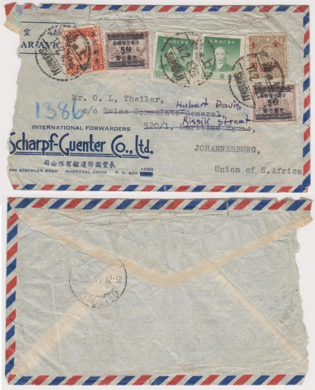 3074 C imageChina 1949 commercial airmail cover to Johannesburg, ex Shanghai 17 Feb with range of adhesives. Cover roughly opened at LHS, readdressed & bears faint Johannesburg 25 Feb reposted b/s. (Image)