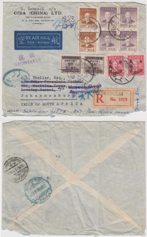 3075 C imageChina 1949 Commercial (CIBA) readdressed reg'd airmail cover to Johannesburg with $100 x 2 & $500 x 4 SYS, $5 on $500 & $20 on $20 x 2. Cover bears blue A.V.2 marking most probably applied in Cairo, & also 27 & 28 March Cairo transit cds on rear together (Image)