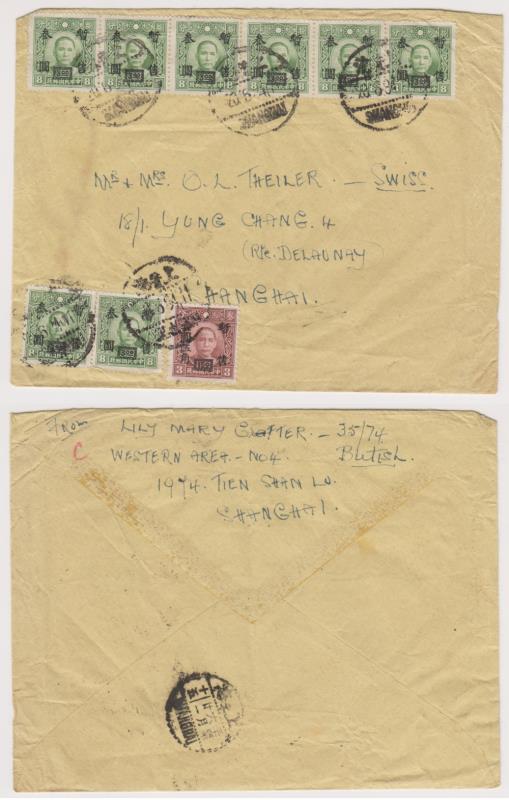 3078 C imageChina-Japanese Occupation of Nangking & Shanghai 1945 local Shanghai cover, 20 June, bearing $1.50 on 3c & $3 on 8c SYS x 8, sent by a British Internee from the Civilian Internment Centre in Lunghwa. (Image)