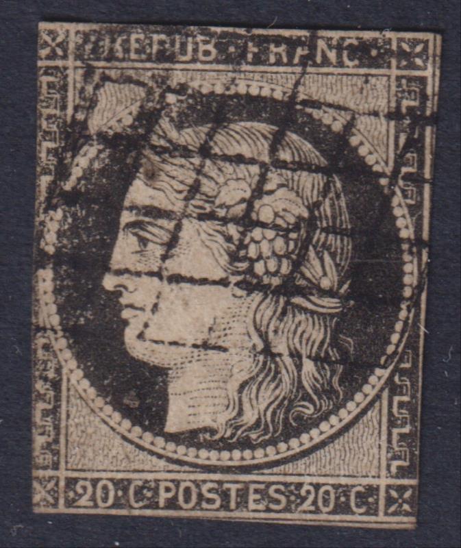3102 U imageFrance 1849 20c Ceres black on white, imperf, cut close or slightly into on all sides. SG 7. Cat £70. FU. (Image)