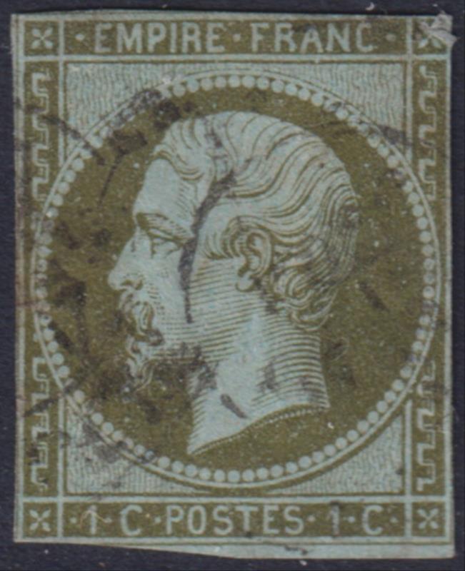 3103 U imageFrance 1860 1c Napoleon III olive-green on green, imperf, cut close on all sides. SG 42a. Cat £120. FU. (Image)