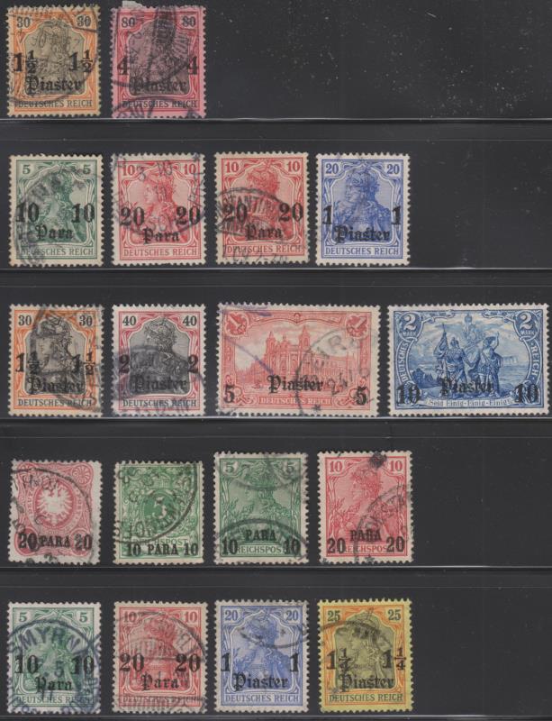 3112 / imageGerman PO's in Turkish Empire 1884-1905 x 18 various on Vario sheet. Noted SG 2, 54, 55 & 56 - latter mint. SG cat £320+. Mostly used. (Image)