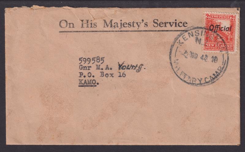 "10") on 2d Official on printed OHMS cover (small). R/s return address on flap "Base HQ, 20th Field Regiment, N.Z.A., Kensington