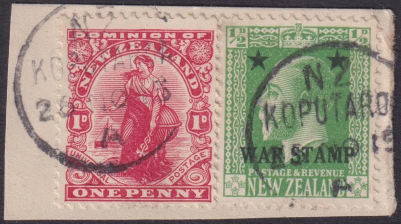 Koputaroa (PM 1909-25) fine 26 Nov 1915 J class cancels x 2 on 1d Dominion & ½d War stamp on piece. Wooders 5. (Image)
