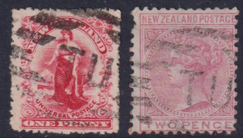 Timaru (1858- ) 2 fine large part strikes of "TU" in 7 bars obliterator on 2d FSF p12 x 11½ (c1878-82 period) & on 1d