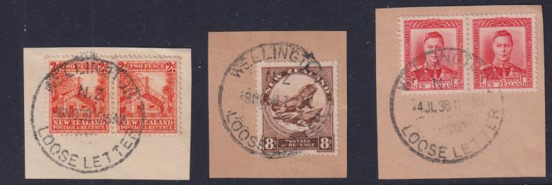 "Wellington/Loose Letter" 33mm C-type cds, 3 good-fine complete strikes on neat pieces 4 JL 38 (GVI 1d pair), 9 NO 38 (8d