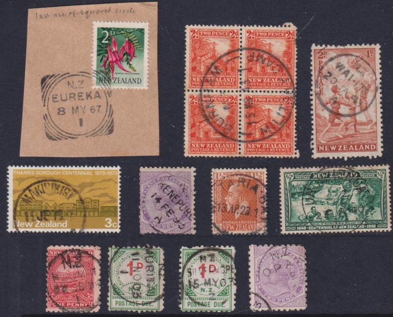 c1882-1967 colln of better cancels (mainly Wooders 4-6): Burnham Military Camp (on 2d Whare block of 4); Eureka (on piece);
