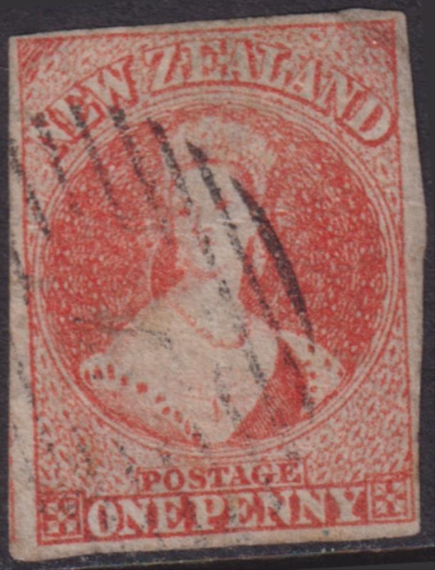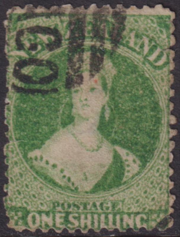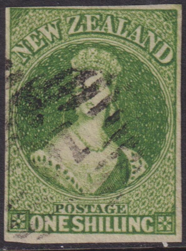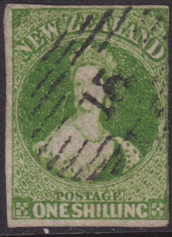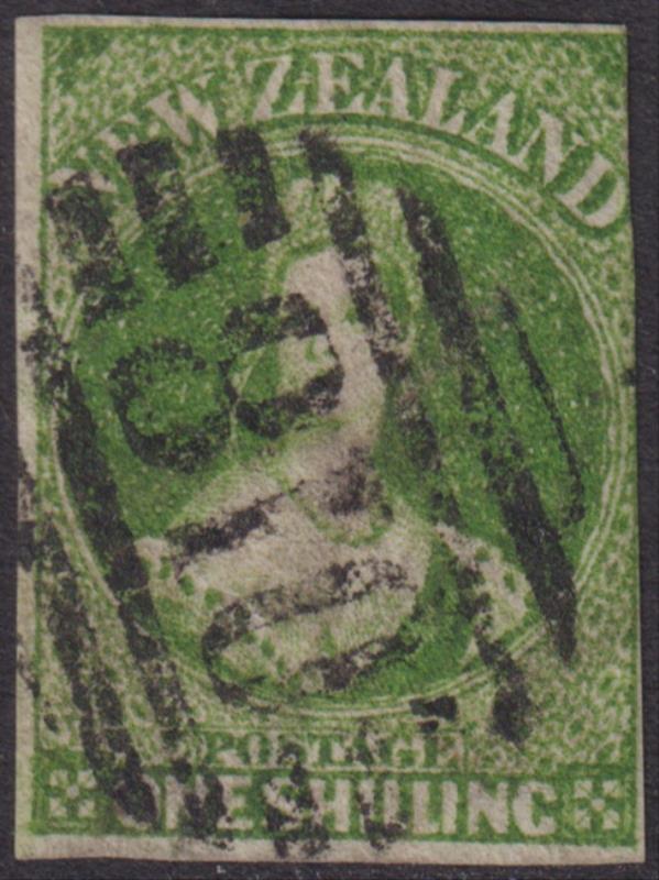FFQ Chalon 1/- green, p13, NZ wmk, heavy barred Otago cancel touches crown, trimmed perfs LHS, tiny perf tear. SG 106. Cat