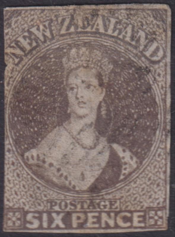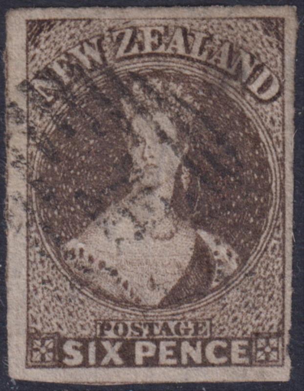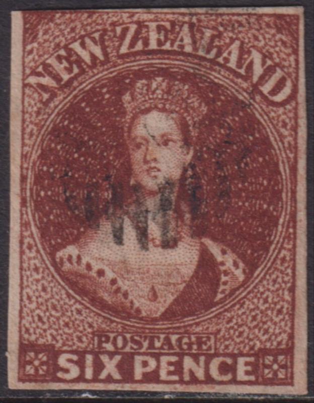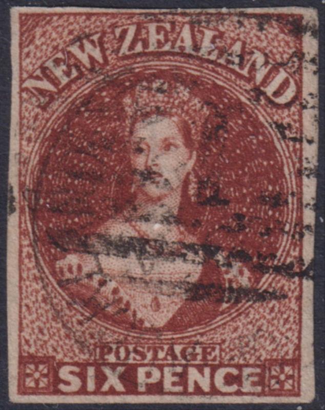 FFQ Chalon 6d red-brown, imperf 3 margins, NZ wmk. SG 99. Cat £950. FU. (Image)