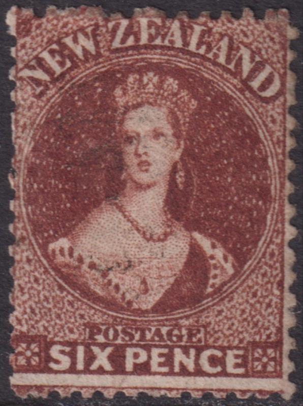FFQ Chalon 6d red-brown, p12½, NZ wmk. SG 108. Cat £65. FU.