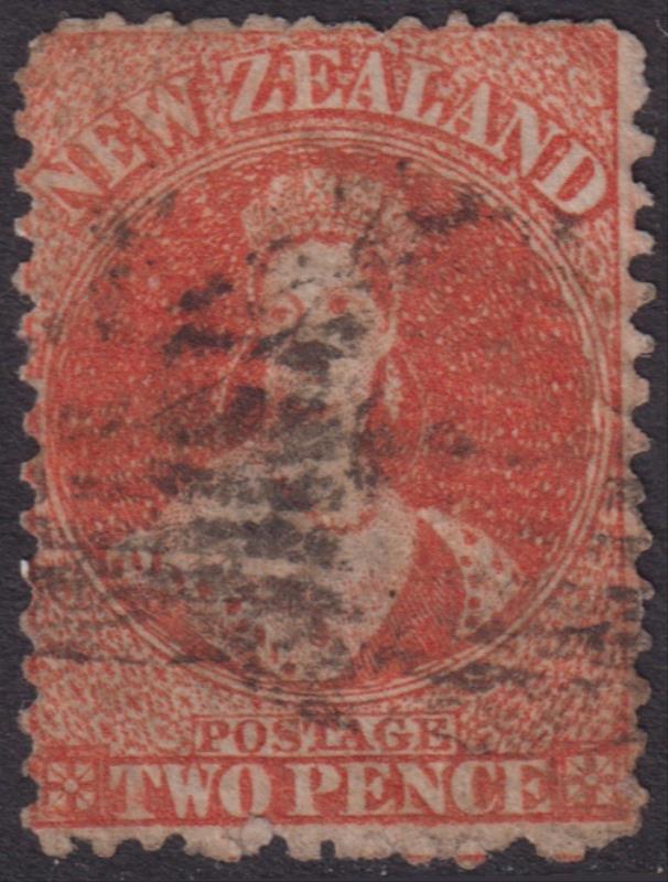 801 U imageFFQ Chalon 2d vermilion, p12½, NZ wmk, very messy pmk. SG 141. Cat £500. GU. (Image)