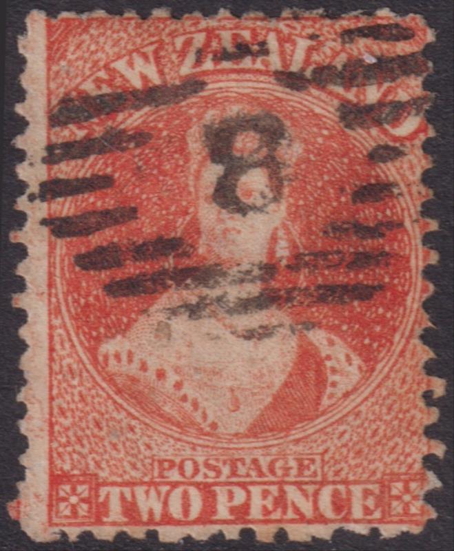 802 U imageFFQ Chalon 2d vermilion, p12½, NZ wmk, clear barred "8" cancel (Wanganui). SG 141. Cat £500. GU/FU. (Image)