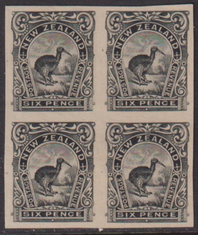 1907 6d Kiwi reduced imperf plate proof black blk of 4, unwmk wove paper. CP EPP15(1). Cat $400. (Image)