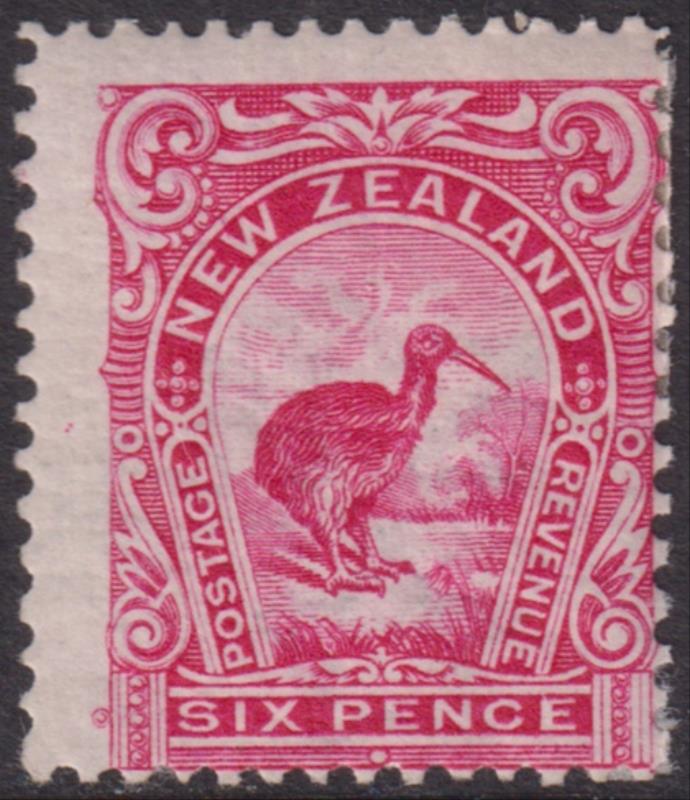 1908 6d Kiwi carmine-pink, reduced, p14 x 12¾-13¼, o/c to lower right. CP E15b. Cat $900. Mint. (Image)