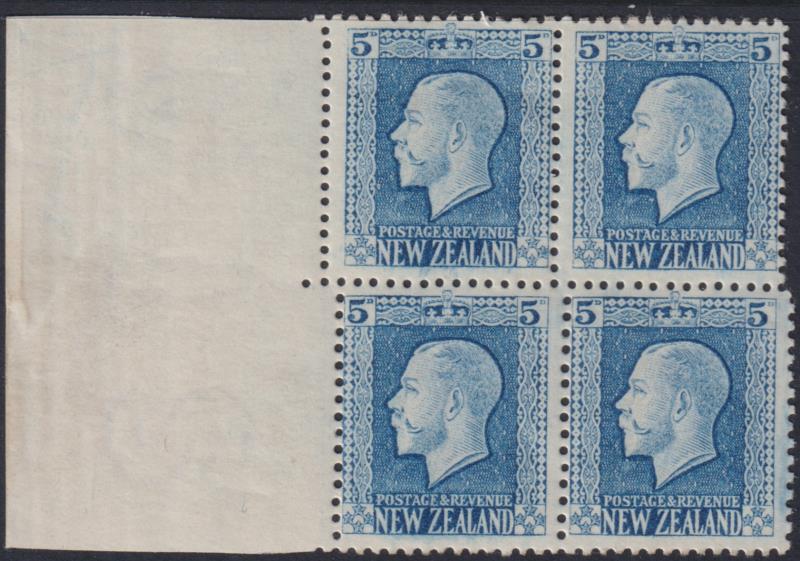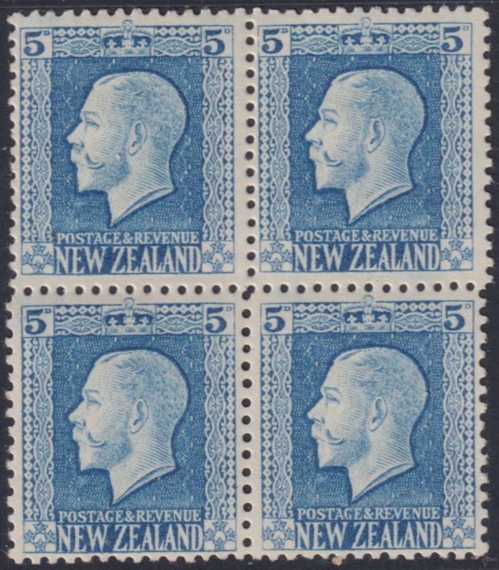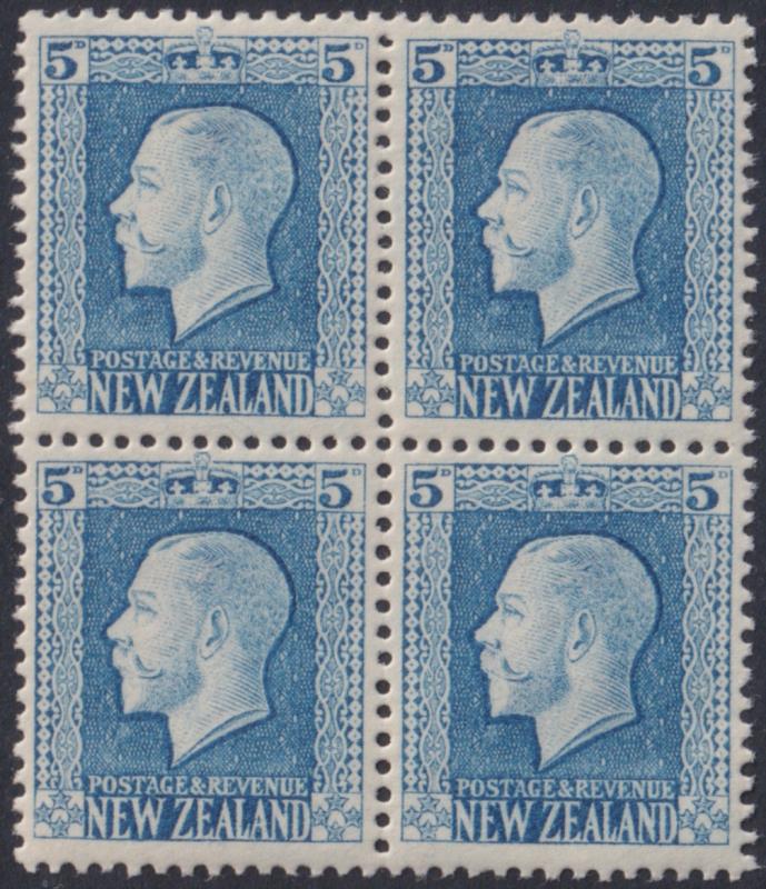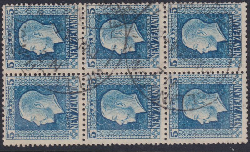1934 5d GV steel blue shade vert block of 6 (issued March 1934), p14 x 14¼. Canc Wellington C.1 C-type cds AU 34. Rare