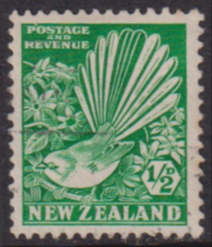 1935 ½d Fantail green, p14 x 13½, single-lined wmk, vert mesh, with R8/1 "clematis" plate flaw. This flaw is on 1st wmk paper