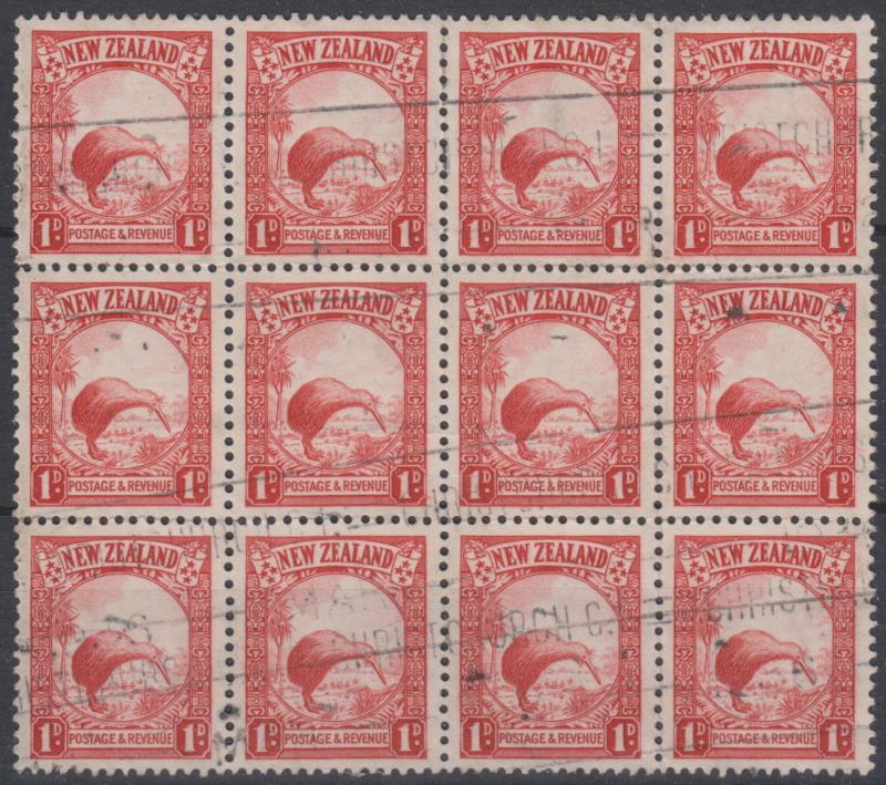 1935 1d Kiwi red block of 12 (4 x 3), p14 x 13½ (1st issue), single-lined wmk, vert mesh. Unusually commercially used, canc