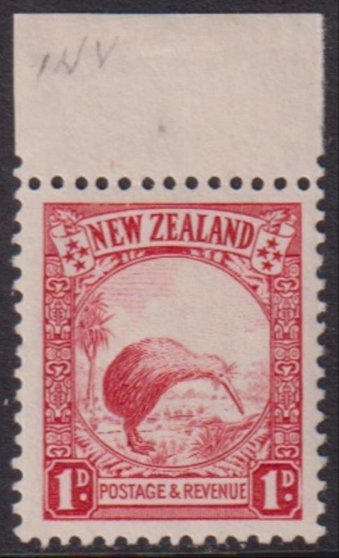 1935 1d Kiwi, p14 x 13½, single-lined wmk, vert mesh, selvedge at top, invtd wmk. CP K2a(z). Cat $40. MUH. (Image)
