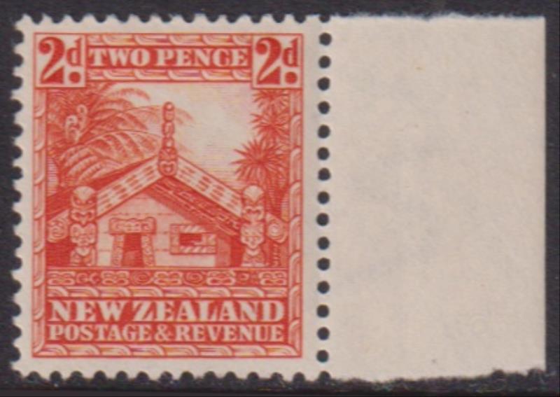 1935 2d Whare orange, p14 x 13½, single-lined wmk, vert mesh, first issue. Has complete large double-lined "W" wmk, ½ on