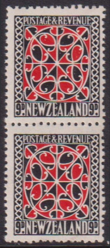1935 9d Panel scarlet & dull black vert pair, p14 x 14½, single-lined wmk, vert mesh. CP E11a. Cat $200. MUH. (Image)
