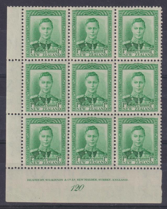 1941 1d GVI green plate block (# 120) of 9, coarse paper, with partial green offset affecting 3mm of stamps in 1st column, &