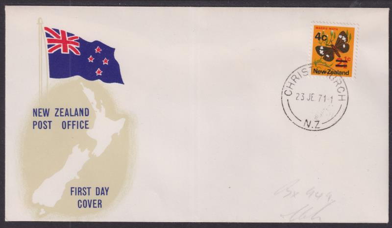 1971 4c on 2½c Moth Pictorial (NZPO generic design) FDC (unaddressed), Christchurch 23 JE 71 cds. ACS cat $250. (Image)
