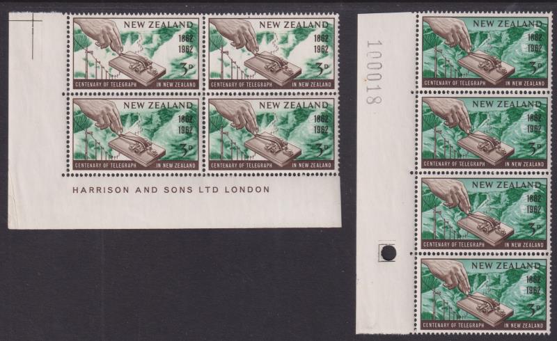 1962 3d Telegraph block of 4 with varying levels of large part missing green. Lower left corner block with selvedges &