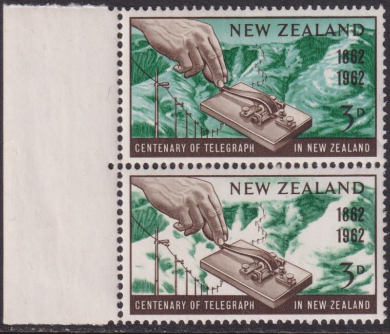 1962 3d Telegraph vert pair with large part green omitted, with normal stamp above. Spectacular & scarce as a pair. CP