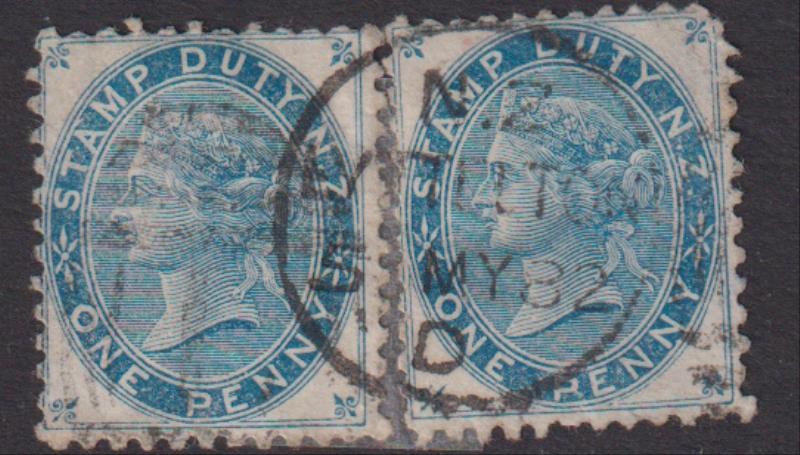 1614 U image1878 1d Stamp Duty blue horiz (reinforced) pair, invtd wmk, fine used LYTTELTON / 5 MY 82 "A" class cancel, postally used during the emergency period in 1882 owing to a shortage of ordinary postage stamps, RH stamp blunt corner. Nonetheless a scarce item (Image)