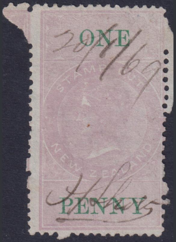 1867 2/- QVLT orange-red & blue, impressed "NZ" monogram "wmk" rouletted on sides. M/s date 1/7/67 & initials cancels. Rare