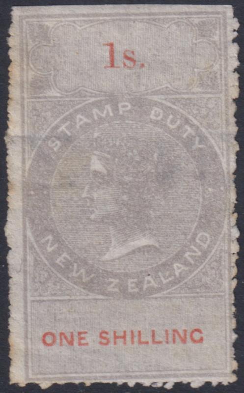 c1867-8 1/- QVLT grey & red, die I, "ONE SHILLING" in 1 line at bottom, small NZ wmk invtd & reversed (normal). With