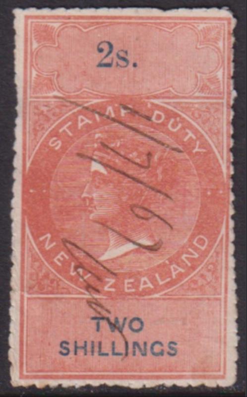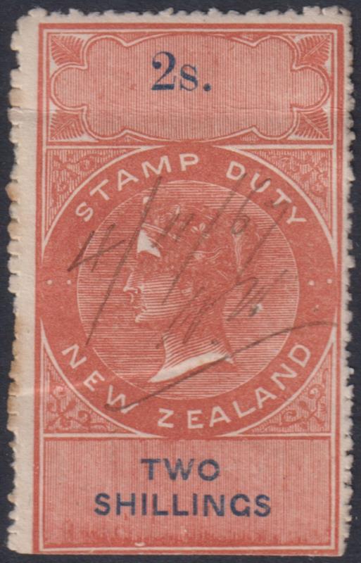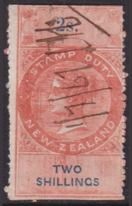 1867 2/- QVLT red & blue, die I, impressed NZ monogram on back. H roulette on all sides. M/s date 1/7/67 & initials cancel.