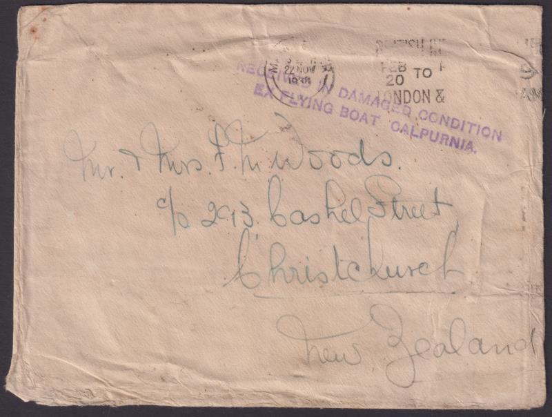1927 C imageGB-NZ 1938 distressed (clear signs of water damage, but largely intact) cover posted Manchester, GB 22 Nov stamp floated off, with fine strike of rubber cachet (violet) "Received in damaged condition-ex flying boat Calpurnia" (all in capitals). The plane (Image)