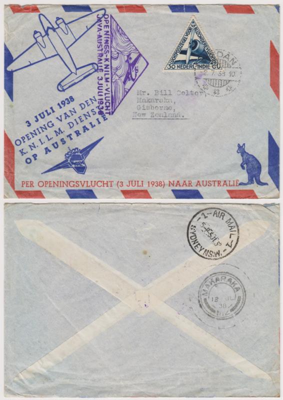1930 C imageIndonesia 1938 illustrated & cacheted FFC to Makaraka, NZ, ex Medan, with Sydney 5 July & Makaraka 13 July b/s (quantity of covers to NZ not recorded, according to Vol 2 - Airmails of NZ). (Image)