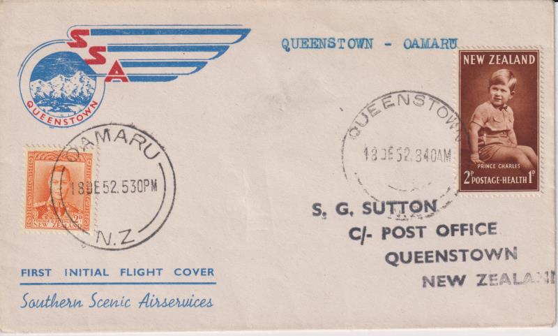 1936 C imageNZ 1952 pictorial FFC (with striking airline logo), Queenstown-Oamaru & return by Southern Scenic Airservices. With 2 x 2d stamps canc a) Queenstown cds 18 DE 52. 8.40AM; & b) Oamaru cds 18 DE 52. 5.30PM. No Queenstown receipt b/s (PO had probably close (Image)