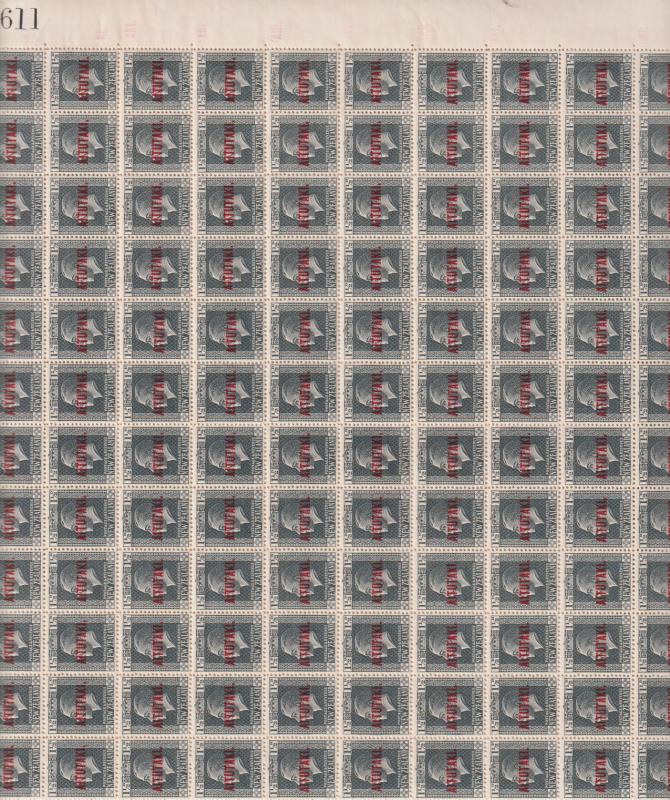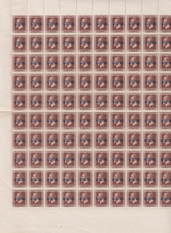 Aitutaki 1917 1½d GV slate, complete sheet of 240, several small selvedge creases & perf separations. SG 21. Cat £1140.