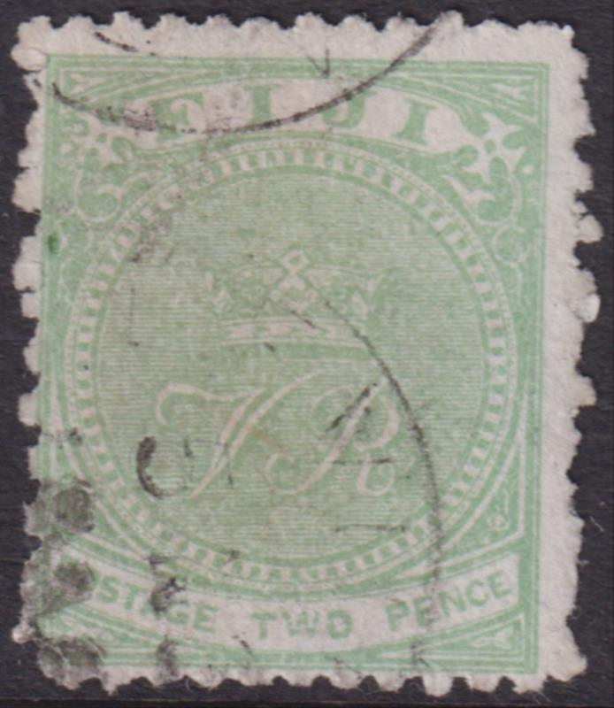 Fiji 1886 2d yellow-green, crown over VR design, p11¾ x 10, ragged p10. SG 51b. Cat £650. FU. (Image)