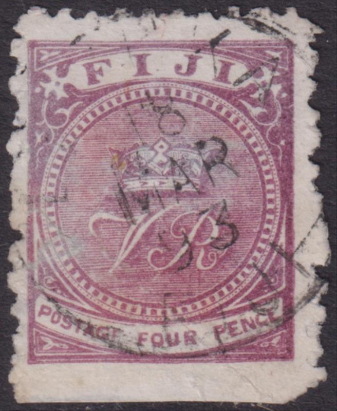 Fiji 1890 4d Crown/VR deep purple, p10 (imperf at base), small surface rub? Dated (18 MAR 93) cds. SG 44a. Cat £75. FU. (Image)