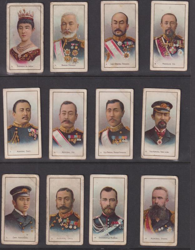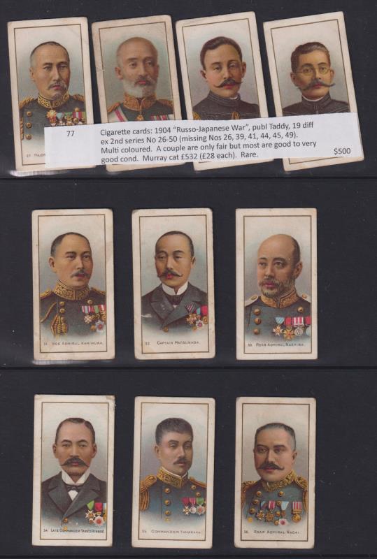 219 imageCigarette cards: 1904 "Russo-Japanese War", publ Taddy, 19 diff ex 2nd series No 26-50 (missing Nos 26, 39, 41, 44, 45, 49). Multicoloured. A couple are only fair but most are good to very good cond. Murray cat £532 (£28 each). Rare. (Image)