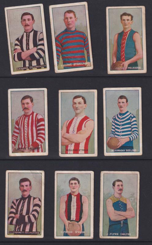 220 imageCigarette cards: 1906 "Australian Footballers" (half-length portraits of Australian Rules players - apparently series B), publ Sniders & Abrahams (Australia - imprint not on cards). Unnumbered. Multicoloured. Range of 18 diff (ex set of 76). One (E Ra (Image)