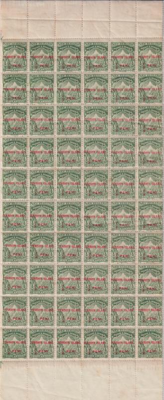 2312 * Penrhyn 1903 3d Huia complete sheet of 120. Ageing affects 4 stamps otherwise fine. Good for study of ovpt, noted 16 "TCRU" (not listed in SG). Rare as complete sheet. Sheet number 362630 in selv. SG 14. Cat £1200. MUH.