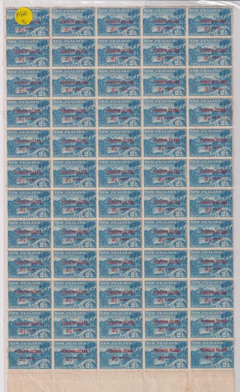 2311 * imagePenrhyn 1902 2½d Wakatipu, right half sheet of 60 (5 x 12) with lower selvedge only, incl column 8 (12 stamps) "½" & "P" widely spaced. Toning affects approx 8 stamps (incl 1 from column 8). SG 1a. Cat £1080. MUH. (Image)