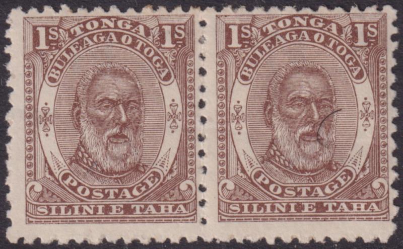 2351 M imageTonga 1892 1/- King George I horiz pair, p12 x 11½, slight adhesions on rear. SG 14. Cat £220. Mint. (Image)