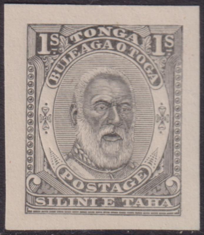 2352 P imageTonga c1892 1/- King George I grey, 21.5 x 25.5mm die proof on unwmkd paper. (Image)