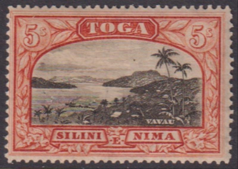 2353 M imageTonga 1897 5/- Vavau Harbour black & brown red, upright turtles wmk. SG 53. Cat £50. LH mint. (Image)