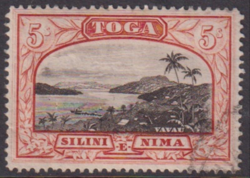2358 U imageTonga 1943 5/- Vavau Harbour black & brown red, multi script CA wmk, smudged canc. SG 82. SG £60. FU. (Image)