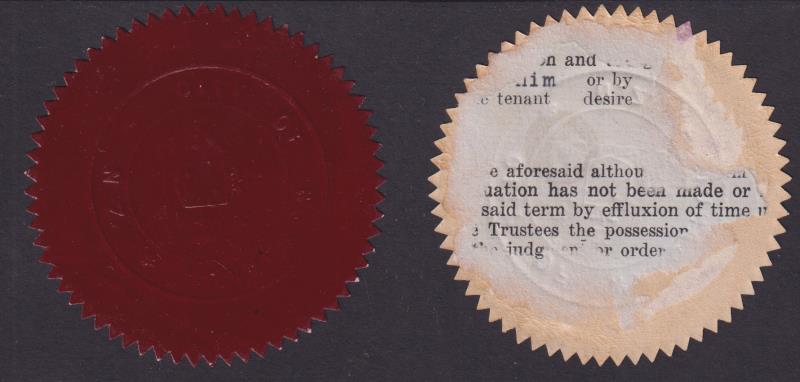 225 imageMunicipal Seal: NZ c1900 large (6.8cm diameter), circular paper seal (deep claret surfacing), with zigzag rim. "Blind" embossed "City of Wanganui N.Z." around town arms. Adhesion on back suggests vintage c1900. (Image)