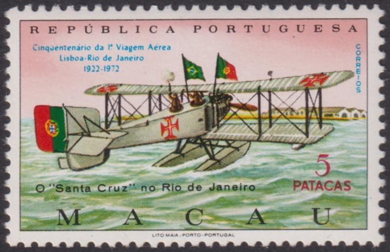 239 * imageAviation: Macau 1972 5p 50th Anniv of 1st Flight from Lisbon to Rio de Janeiro (floatplane), multicoloured. SG 519. Cat £43. MUH. (Image)
