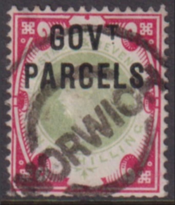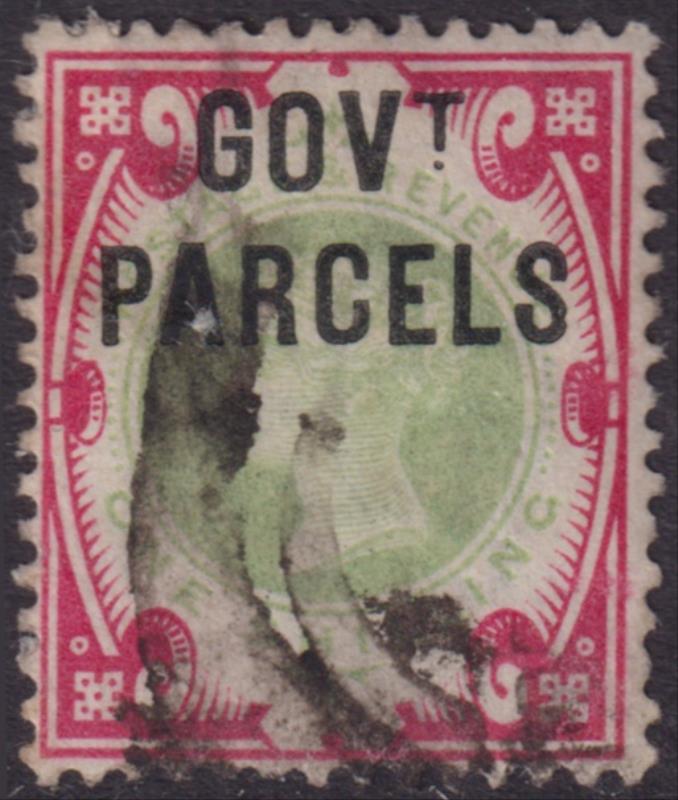 1902 1/- EVII dull green & carmine, GOVT. / PARCELS. SG O78. Cat £200. GU. (Image)