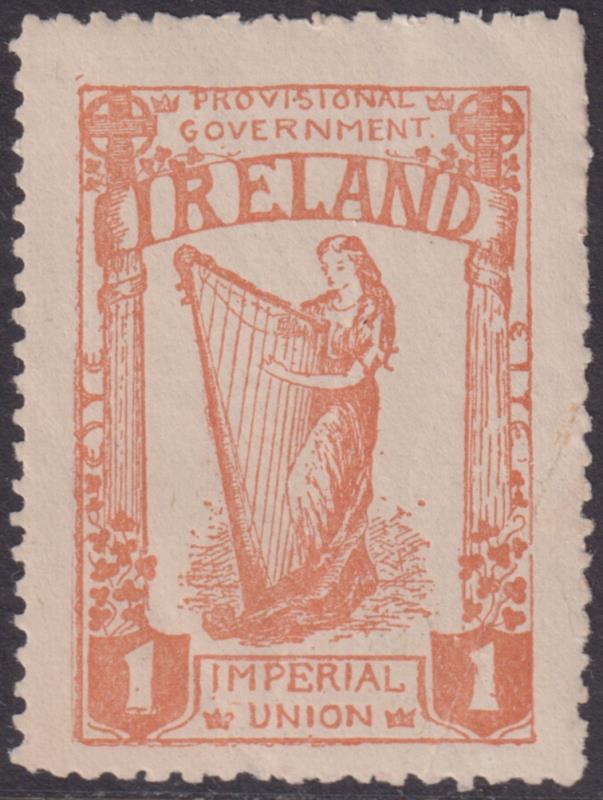 c1900 "Provisional Government/Ireland/Imperial Union" perforated political propaganda label, orange (harp player).